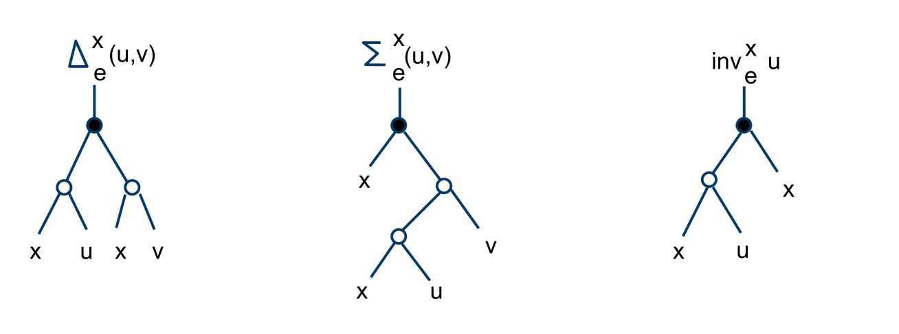 As a circuit made by gates (in the second image), a tangle diagram appears as an ordered list of its crossings gates, each crossing gate being given as a pair of FAN-OUT and one of the other two gates. 1-valent nodes appear as input nodes (in a separate INPUT list), or as output nodes (in the OUTPUT list). The wiring is given as a matrix of connectivity, namely the element corresponding to the pair of nodes (from the trivalent and 1-valent graph, independently on the pairing of nodes given by the crossings) is equal to if there is a wire oriented from to to , otherwise is equal to . The definition is unambiguous because from to can be at most one oriented wire.