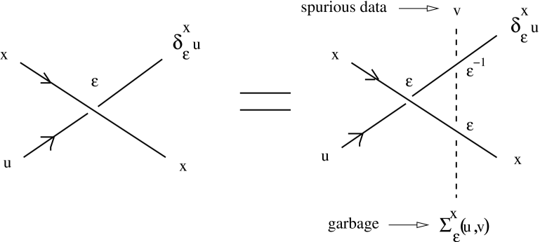 In terms of trivalent graphs, the condition (R1) from definition 3.1 applied for the irq is graphically translated into the following identity (passing from one term of the identity to another is a ”Reidemeister I move”).